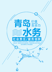 标识以上下结构为主,左右结构为辅,上部以浅蓝色外圆内方构图,下部居中配深蓝色黑体“青岛水务”汉字及英文构成。上部图案中心为汉字“水”及灰色英文“water”水字的首字母“W”的变形,直观地展现了行业属性;竖形管道状“川”字的造型,代表上水、中水、排水三大主要业务。中心延伸出的圆形构成英文青岛的首字母“Q”的变形,体现了水务集团总部的归属地,体现了水处理源于自然回归自然循环往复的行业特性。外圆内方构图赋予了健康、稳定、安全、环保、包容、和谐、博大、阳光的内涵。下部“青岛水务”汉字及英文庄重、稳健,上下部连接,如同一轮朝阳在天际间冉冉升起。